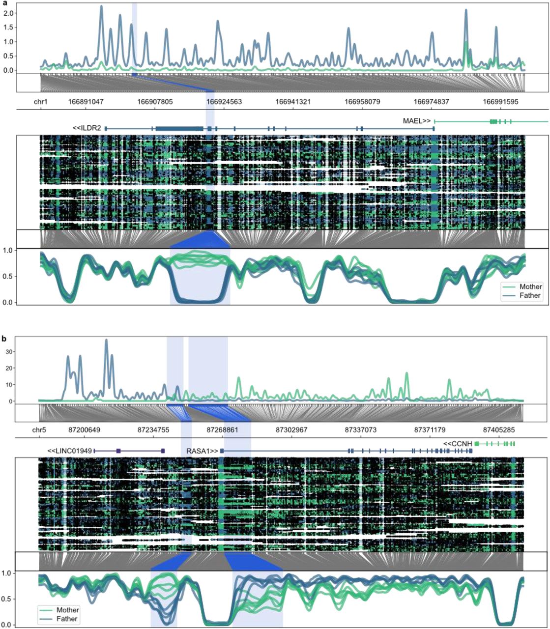An image of the two novel DMRs discovered by Kindlova et al. (2023). The upper image shows the DMR on an exon of ILDR2 and the lower image shows the atypical-looking DMR around the RASA1 promoter.