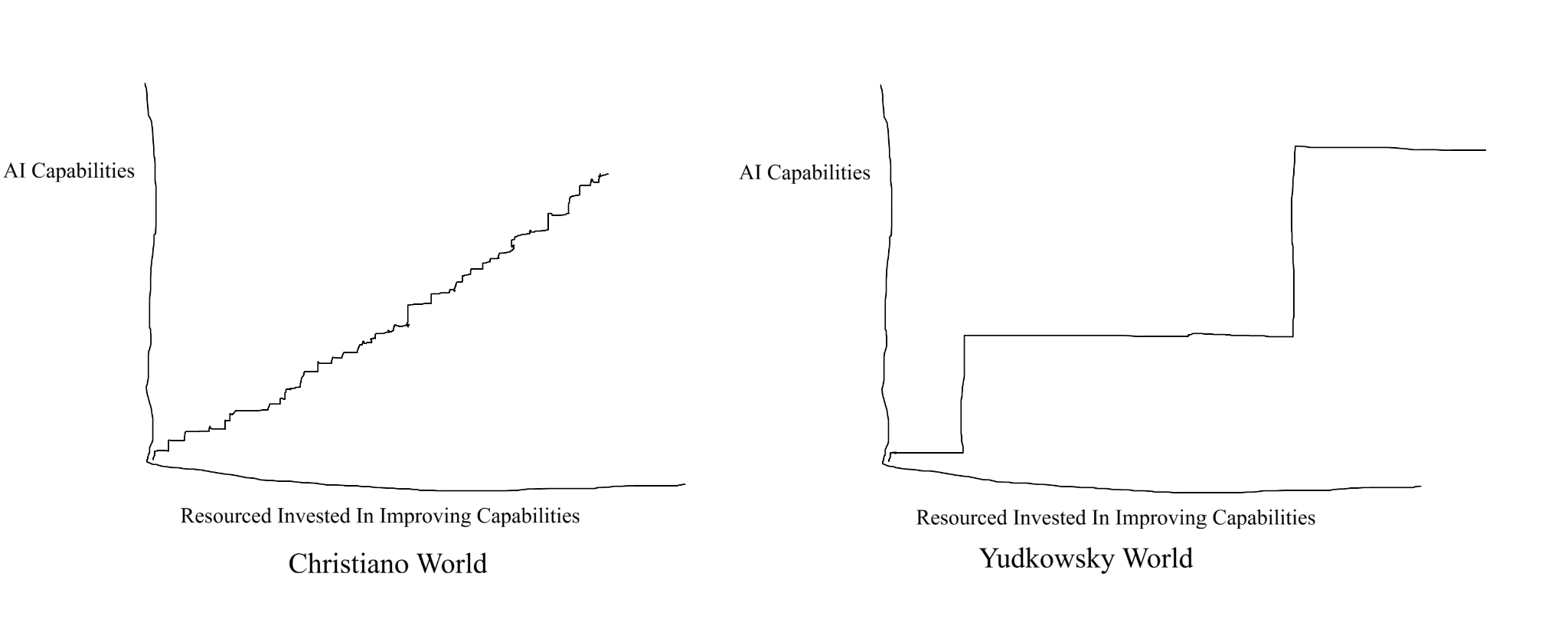 The core of Paul Christiano’s model is that “Before we have an incredibly intelligent AI, we will probably have a slightly worse AI.” In later works, he seems to describe his view as progress happening in steady steps once you’ve got a lot of resources poured into making it happen. Whereas Yudkowsy’s model has more room for big insights that dramatically improve AI systems which are hard to predict ahead of time, but in retrospect clearly followed a trend.