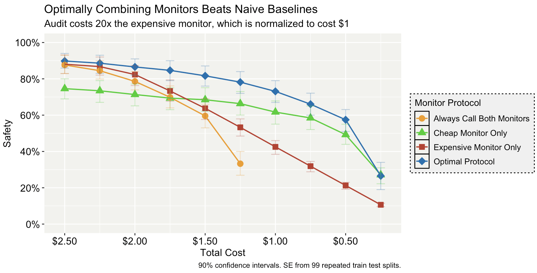 In this post, we’ll illustrate how to apply an algorithm that optimally combines these monitors. We’ll give a detailed example using a setting where we have access to a probe monitor and a black box monitor using data from Parrack et al. (2025). Our paper on arXiv contains more details on our mathematical model, algorithm, and empirical results on a control setting using two LLM monitors of different sizes. We show that our optimally constructed monitoring protocol beats naive baselines.[1]