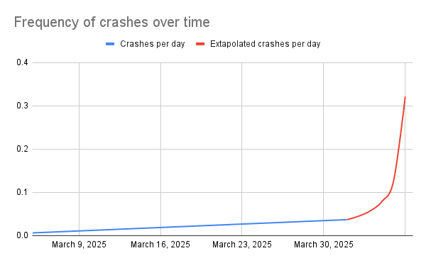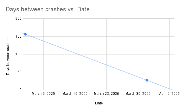 See, this is what happens when you extrapolate data points linearly into the future. You get totally unrealistic predictions. It's important to remember the physical constraints on whatever trend you're trying to extrapolate. Importantly for this issue, you need to remember that time between successive crashes can never be negative, so it is inappropriate to model intervals with a straight line that crosses the time axis on April 7.