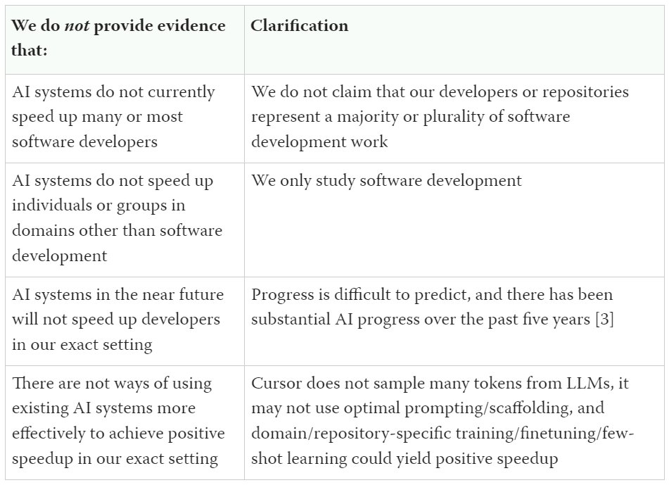 A recent paper by METR found negative results regarding the usefulness of AI-based coding assistance for expert developers. One wrong takeaway from this is that current AI coding systems are net harmful for coding across the board. The authors have gone to considerable effort to clarify what exactly their results do not say, both on X and in the report itself: