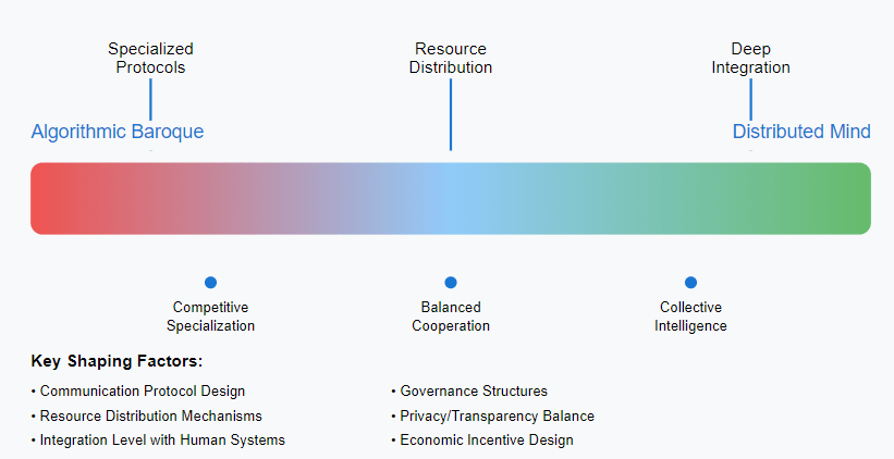 In one path, agents might develop highly specialized languages and protocols for their specific domains. A financial trading agent optimizing for market prediction accuracy might develop representations incompatible with a medical diagnosis agent optimizing for patient outcomes. Each agent, in minimizing its own prediction errors, creates increasingly specialized and isolated models. This specialization, while locally optimal for free energy minimization, leads toward the Algorithmic Baroque—a future of brilliant but barely interoperable systems.