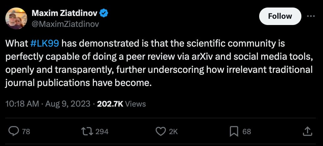 Remember LK-99, the putative room-temperature superconductor? Well, that episode was initially touted as a success of the “publish PDFs on the internet” model and of “open science.” However, this was not the case. From day one, experts almost universally labeled LK-99 as junk science. They pointed to the physical implausibility of the findings, the author’s suspicious website, similar claims made in the past that didn’t pan out, anomalies in the data, and obvious scientific errors sprinkled throughout the text. Even so, LK-99 managed to garner a huge amount of attention on Twitter.6