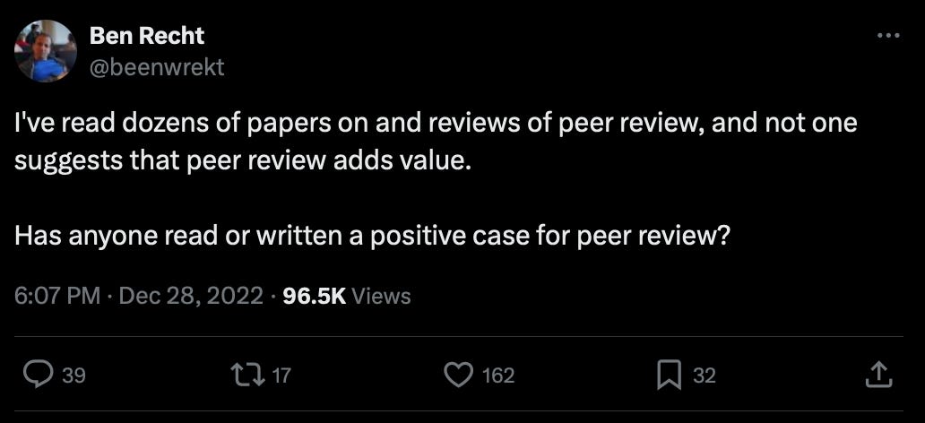 Still, shortly after I read Mastroianni’s article, Ben Recht asked on Twitter if there were any articles presenting “a positive case for peer review.” And while many individualsresponded to Mastroianni, and a smattering of defenses of peer review have been published, I found it difficult to locate a comprehensive steelman of the practice. This article attempts to fill that lacuna.