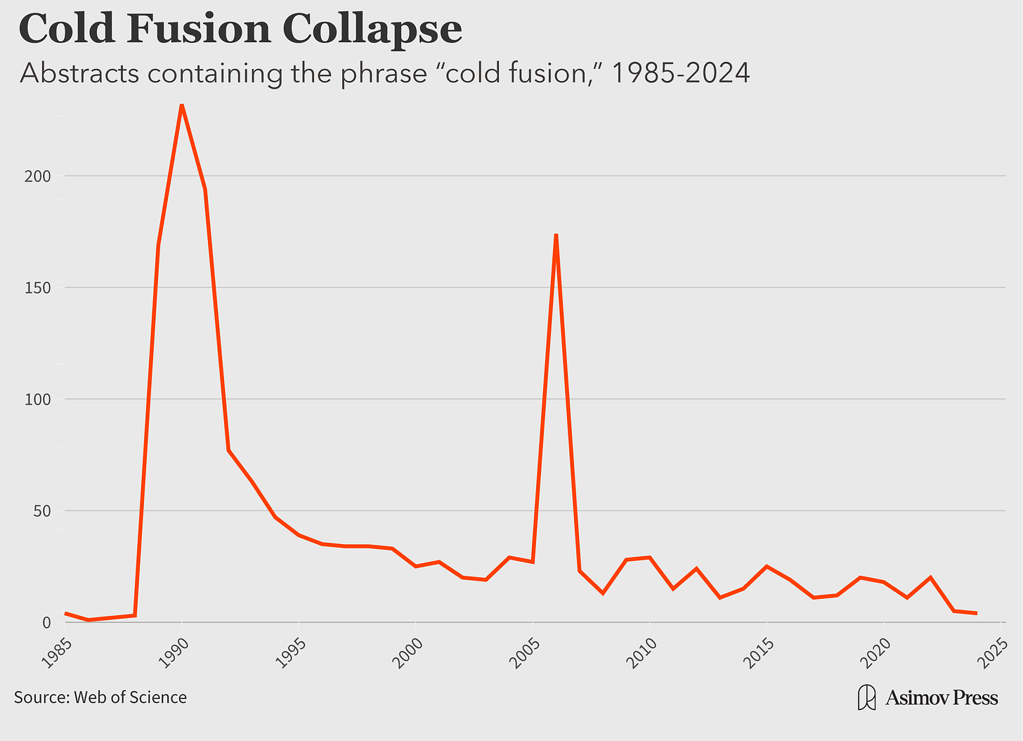 The chemist Irving Langmuir described such episodes as “pathological science.” Pathological science starts with data published alongside a big, bold, exciting claim. Typically, the evidence presented has a small effect size or one just on the edge of statistical significance. Scientists then spend years chasing after confirmatory evidence. Historical examples of pathological science abound, including animal magnetism, N-rays, cold fusion, polywater, resonant cavity thrusters, the Mpemba effect, water memory, exclusion-zone water, and magnetic water treatment.8 (Note that pathological science is distinct from pseudoscience, which doesn’t follow scientific standards at all.)