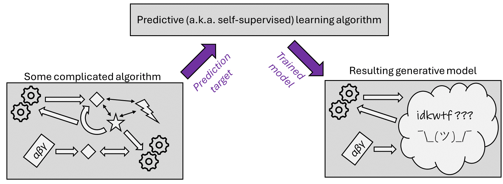 The idea that a simpler generative model can’t predict the behavior of a big complicated algorithm is hopefully common sense, but for a related formalization see “Computational Irreducibility” (more discussion here).