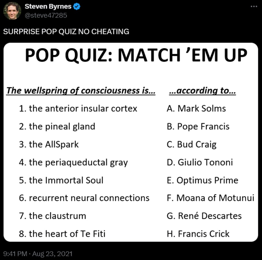 “The Standard Model of Particle Physics including weak-field quantum general relativity (GR)” (I wish it was better-known and had a catchier name) appears sufficient to explain everything that happens in the solar system (ref). Nobody has ever found any experiment violating it, despite extraordinarily precise and varied tests. This theory can’t explain everything that happens in the universe—in particular, it can’t make any predictions about either (A) microscopic exploding black holes or (B) the Big Bang. Also, (C) the Standard Model happens to include 18 elementary particles (depending on how you count), because those are the ones we’ve discovered; but the theoretical framework is fully compatible with other particles existing too, and indeed there are strong theoretical and astronomical reasons to think they do exist. It’s just that those other particles are irrelevant for anything happening on Earth—so irrelevant that we’ve spent decades and billions of dollars searching for any Earthly experiment whatsoever where they play a measurable role, without success. Anyway, I think there are strong reasons to believe that our universe follows some set of orderly laws—some well-defined mathematical framework that elegantly unifies the Standard Model with all of GR, not just weak-field GR—even if physicists don’t know what those laws are yet. (I think there are promising leads, but that’s getting off-topic.) …And we should strongly expect that, when we eventually discover those laws, we’ll find that they shed no light whatsoever into how consciousness works—just as we learned nothing whatsoever about consciousness from previous advances in fundamental physics like GR or quantum field theory.