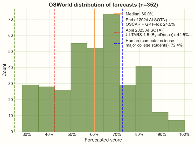 Forecasters expected most of the gap between 2024 AI and human performance to close by the end of 2025. By April, we're already seeing strong progress on OSWorld, about halfway to forecasters' median estimate. See Agent Village to get a sense of current computer use capabilities.