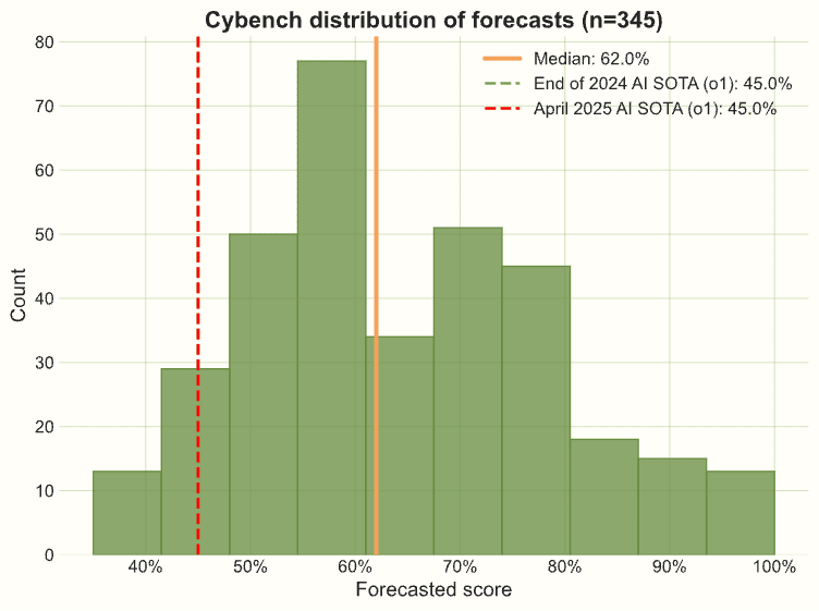 Note that when the survey was running, we weren't aware of that US AISI evaluated o1 and it scored 45% on Cybench. In our survey materials, we therefore told respondents that the SOTA was 35%, which is what Claude Sonnet 3.5 (New) scored.