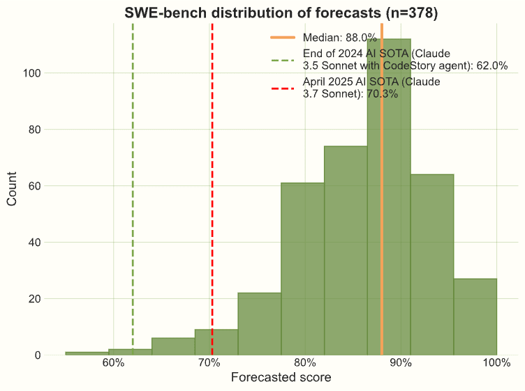 Forecasters expected progress on the popular SWE-bench Verified benchmark to continue apace, likely saturating by the end of 2025. In December 2024, performance rose from 55% to 62%, and since then it has risen to 70%.