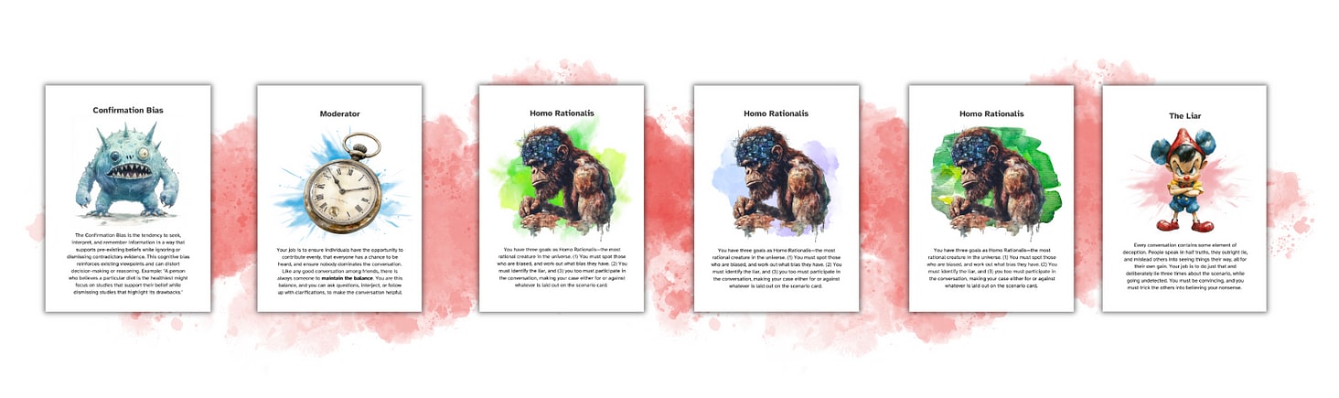 To be fair, the game is not easy, because it is frequently not easy to role play biases, which are highly varied, in scenarios which you commonly don't see them appear in. For instance, it is difficult to act out a social desirability bias when debating if Pho is better than Ramen. But, my suspicion, is that this difficulty layer actually ads to the learning process, by having individuals process the concepts at more complex layers of cognitive deliberation (layers-of-processing-effect). But I do think it is effective and with time, I’m hoping to try and run a study around it to see if I can actually improve, maybe with a kind of randomised trial, the decision making abilities of individuals with exposure to the game.