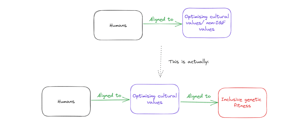 In this view, the "sharp left turn" of humanity wasn't that our brains suddenly became magical. It's that the inner optimizer (our brain) developed a technology (culture, language) that finally allowed its high-speed learning to accumulate across the generations, bypassing the slow, low-slack outer loop. Suddenly, the results of trillions of learning steps per generation started compounding, and the rate of capability gain exploded. The alignment to the original outer goal (IGF) predictably broke down because it was only ever enforced by a loose web of proxy goals (hunger, lust, etc.) that were insufficient to steer the now-compounding inner optimizer.