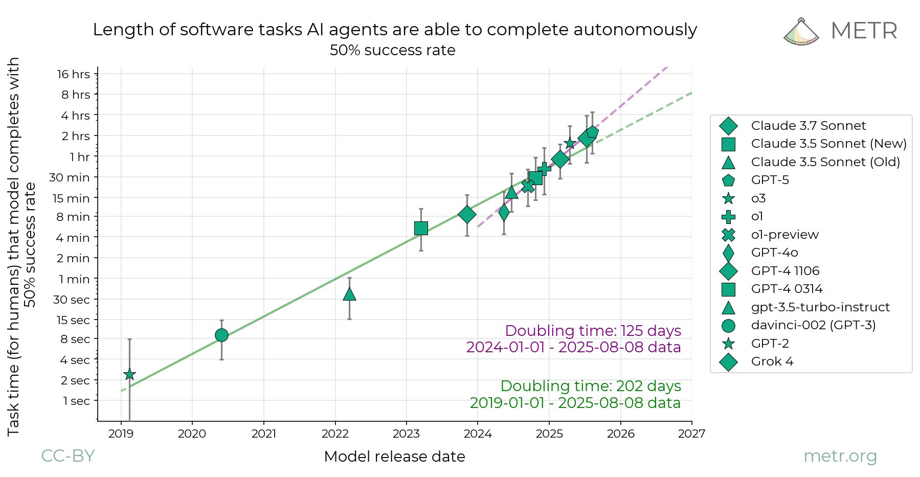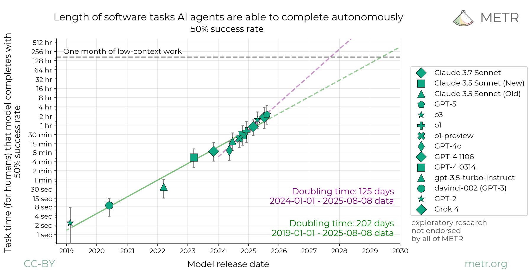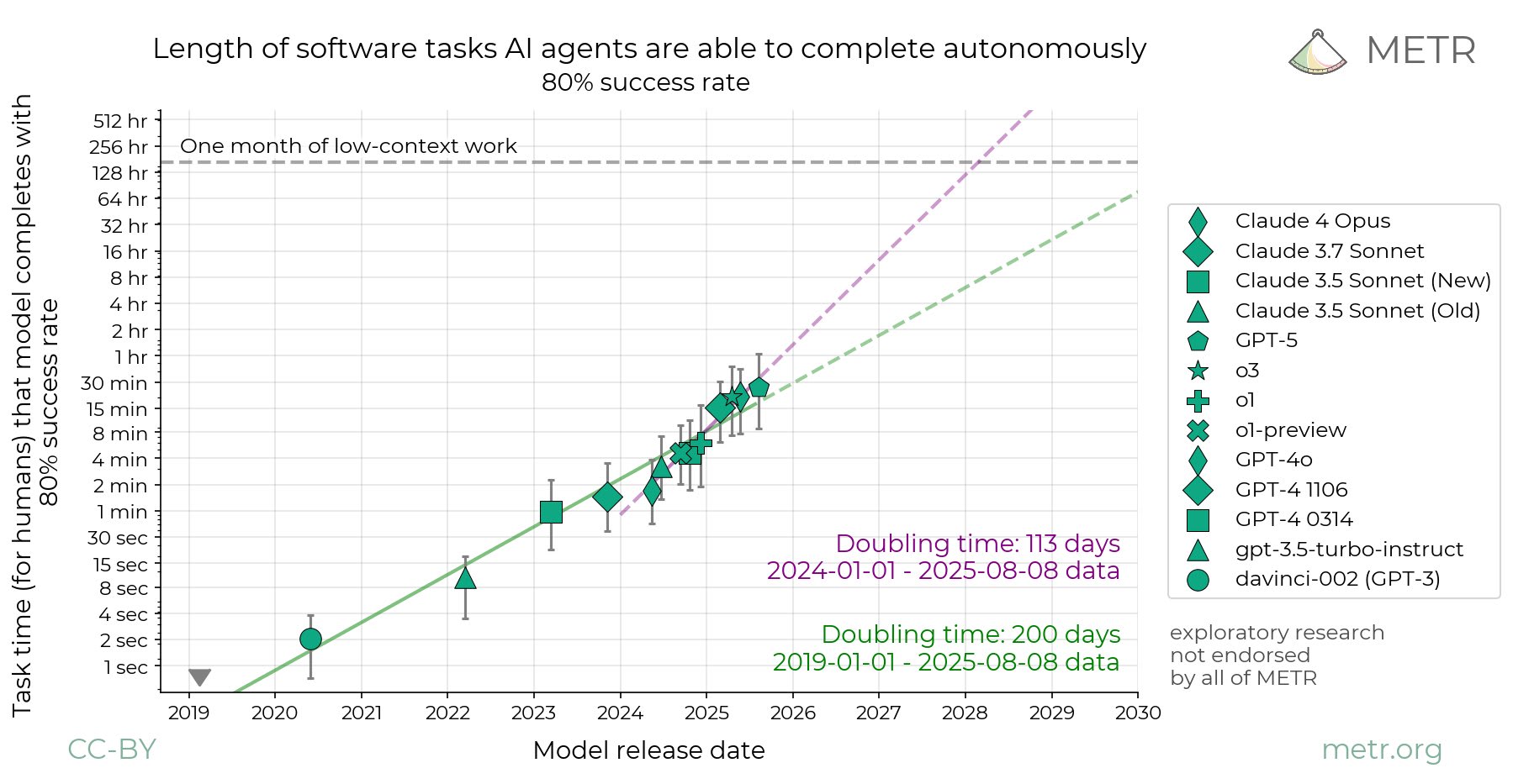 There's something that I think is usually missing from time-horizon discussions, which is that the human brain seems to operate on a very long time horizon for entirely different reasons. The story for LLMs looks like this: LLMs become better at programming tasks, therefore they become capable of doing (in a relatively short amount of time) tasks that would take increasingly longer for humans to do. Humans, instead, can just do stuff for a lifetime, and we don't know where the cap is, and our brain has ways to manage its memories depending on how often they are recalled, and probably other ways to keep itself coherent over long periods. It's a completely different sort of thing! This makes me think that the trend here isn't very "deep". The line will continue to go up as LLMs become better and better at programming, and then it will slow down due to capability gains generally slowing down due to training compute bottlenecks and due to limited inference compute budgets. On the other hand, I think it's pretty dang likely that we get a drastic trend break in the next few years (i.e., the graph essentially loses its relevance) when we crack the actual mechanisms and capabilities related to continuous operation. For example, continuous learning, clever memory management, and similar things that we might be completely missing at the moment even as concepts.
