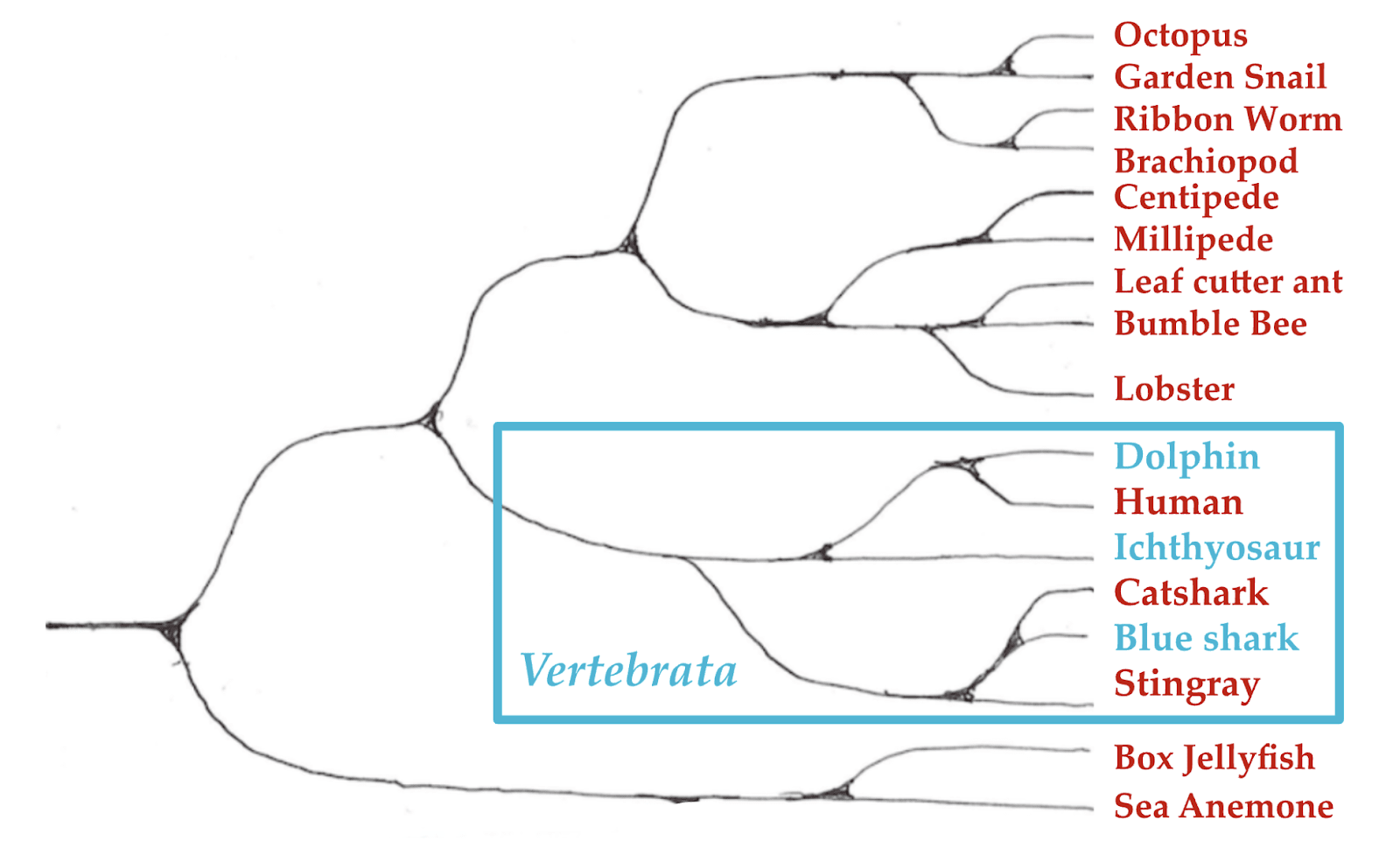 Figure 5: Phylogenetic tree of animal life, showing that shark-like morphology is contingent on there being vertebrates. Invertebrate large aquatic predators, such as octopi, lobsters, or box jellyfish, do not converge to this morphology.[10]