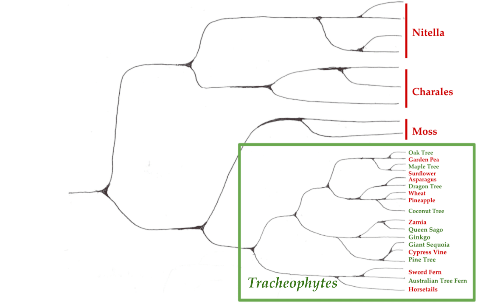 Figure 4: Phylogenetic tree of plant life, which encompasses both of the parts shown in figures 3a and 3b. It shows that trees are contingent on tracheophytes, or vascular plants. Within tracheophytes, trees are a highly convergent form of life.[9]