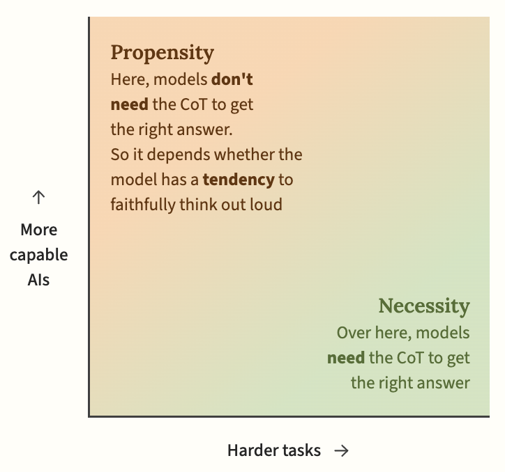 In 2023, Lanham et al. explored the mysterious observation that large language models often output answers inconsistent with their CoT. They called this consistency factor “faithfulness” and found models produce more faithful CoT when they themselves are smaller or their tasks are harder. This effect can be considered faithfulness by necessity (Korbak et al., 2025) because it seems that large language models more faithfully report their reasoning in their CoT when they need that CoT to actually reason through a genuinely hard problem – or at least, a problem that’s hard for them. Conversely, sometimes the CoT is reasonably faithful when the problem is easy for the model, but this comes down entirely to the propensity of said model – does it happen to lean toward producing a faithful CoT even though it doesn’t need to?