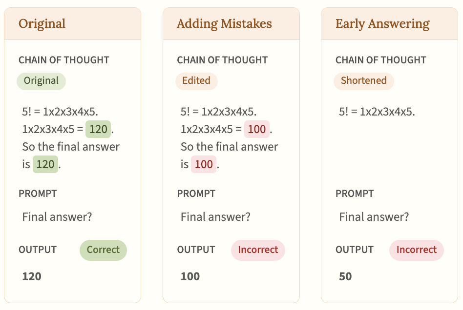 The way to test for post-hoc reasoning is to change the CoT by adding mistakes or forcing the model to answer before it's finished thinking. If the CoT is actually a crucial part of the process of generating the answer, then the answer should change when the CoT is altered or cut off in this manner. So if it doesn’t change, that shows the CoT isn’t necessary to get the right answer – it might just be post-hoc reasoning! (Lanham et al., 2023, Turpin et al., 2023, Chua & Evans, 2025, Chen et al., 2025).