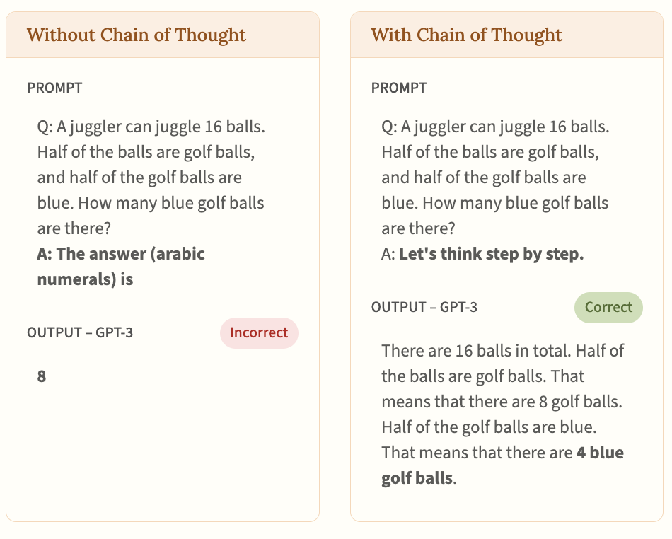 A classic example of chain of thought prompting (Kojima et al., 2023)