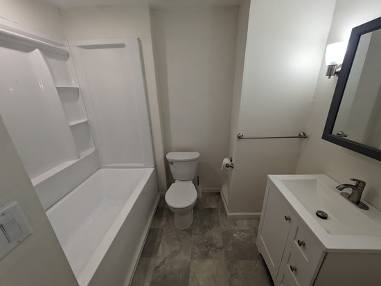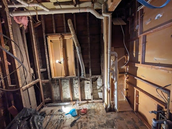 This took two days because they needed to completely redo the toilet and sink drains: the toilet drain was cast iron and falling apart, while the sink drain was illegally tied into the kitchen sink.