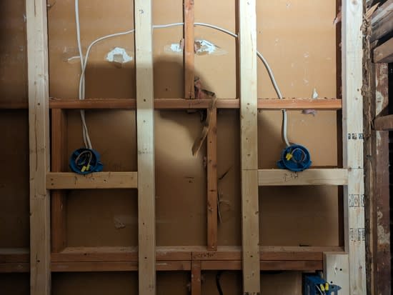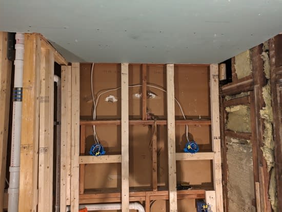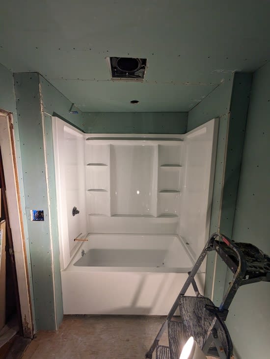 Sun 1/21: wall drywall in the morning with help from Peter, tub surround in the afternoon with help from Devan, wall drywall in the evening alone