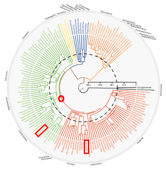 This red circle is well before the K-T boundary (indicated by the dotted line), hence represents a mammal living in the literal shadow of the dinosaurs.