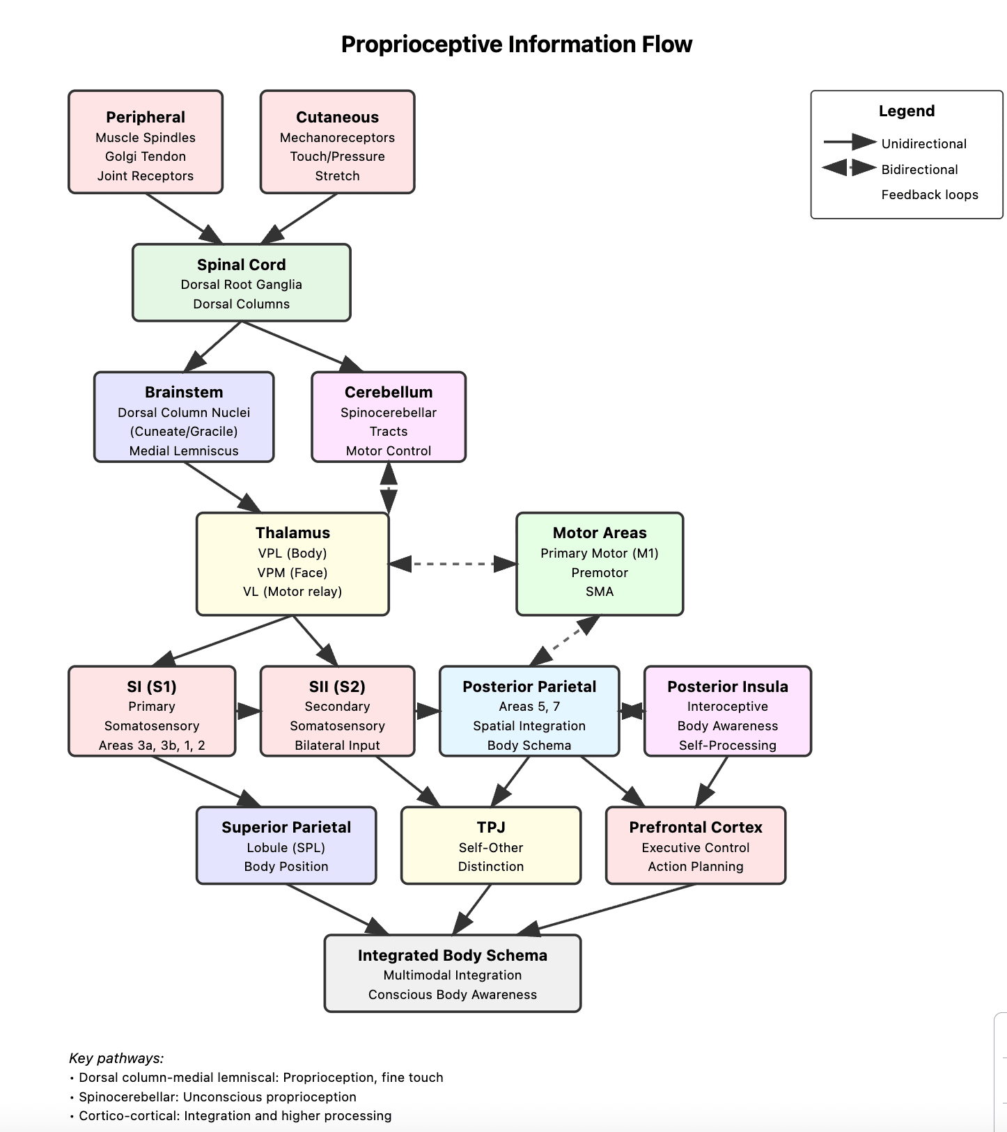 The problem can start peripherally, with injury to a limb, or centrally, with damage directly to a proprioception-related brain region, usually in the right parietal lobe or temporo-parietal junction, but potentially also “lower” in the subcortical regions like the thalamus.