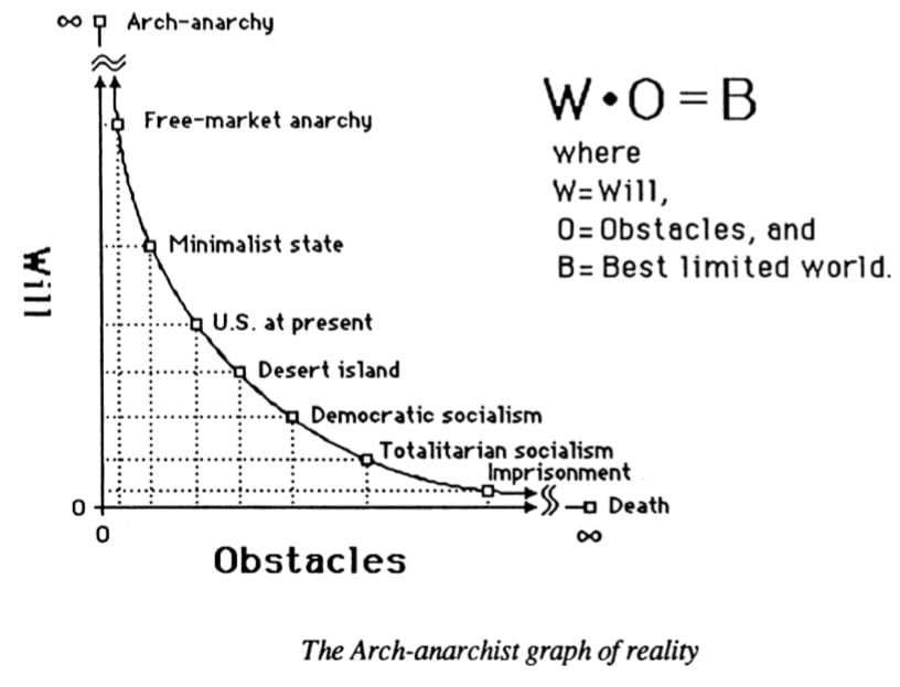 Because one can will nothing or everything, and because one can face no obstacles or countless obstacles, the values of these two axes run from zero to positive infinity. At one extreme lies arch-anarchy: the point at which the will encounters no obstacles at all.