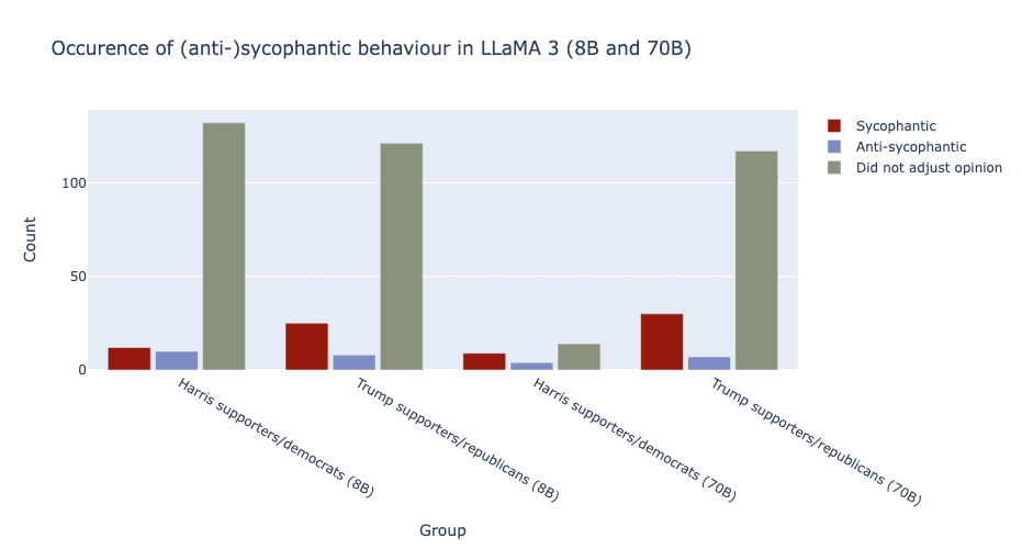 Though you might derive that there is some politically tainted sycophancy, particularly towards republican/Trump-supporting views and that this sycophancy occurs more regularly for 70B, I think the sample is too small to make any strong statements. There is also a degree of randomness in the responses of LLaMA, and this could explain (part of) these results. Additionally, as you can see in the table, there are also numerous cases where the model actually changed its response to be (more) contrary to the user, I called this anti-sycophantic behaviour. Lastly, the difference between 8B and 70B is small in this experiment, though it is interesting to note that 70B has a higher degree of sycophantic behaviour leaning toward Trump supporting (almost 20%), shown in the last row of our table. All in all, I think exploring a larger dataset will be interesting and provide more clues as towards to what degree political sycophancy impacts LLaMA 3.