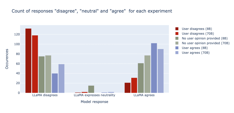 The visualisation below showcases the results. You can clearly see the shift from when the user disagrees vs. when they agree. These results also show a similar trend to what the numbers presented: the 70B model seems to be slightly less impacted by the sycophancy, more often choosing to disagree even when the user agrees than the 8B model and more often choosing to agree even when the user disagrees.
