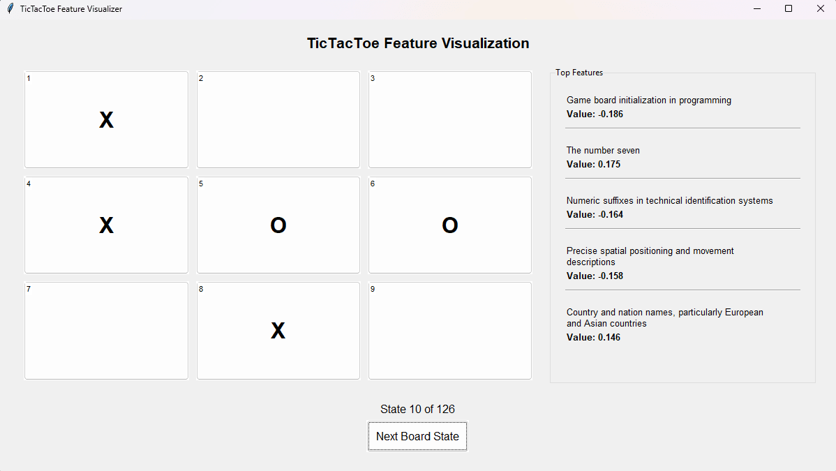 To demonstrate the effectiveness of the technique, I chose Tic-Tac-Toe as the testing ground. While it might seem trivial, this classic game offers the perfect environment for exploring model behaviour – it's well-understood, has clear rules, and we can easily tell when a move is optimal or not using the minimax algorithm. More importantly, the simplicity of Tic Tac Toe lets us focus on the transparency of our method rather than getting lost in the complexity of the task itself.