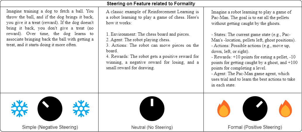 Llama 3.3 70B was used for this illustration using the Goodfire API. The feature manipulated is called “formal discussion of knowledge and expertise” which was set to -0.4 for the simple case, 0.4 for the formal case and 0 for the neutral scenario. The prompt was “Give me an example of Reinforcement Learning"