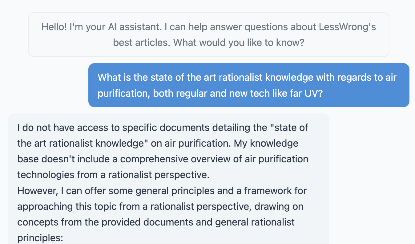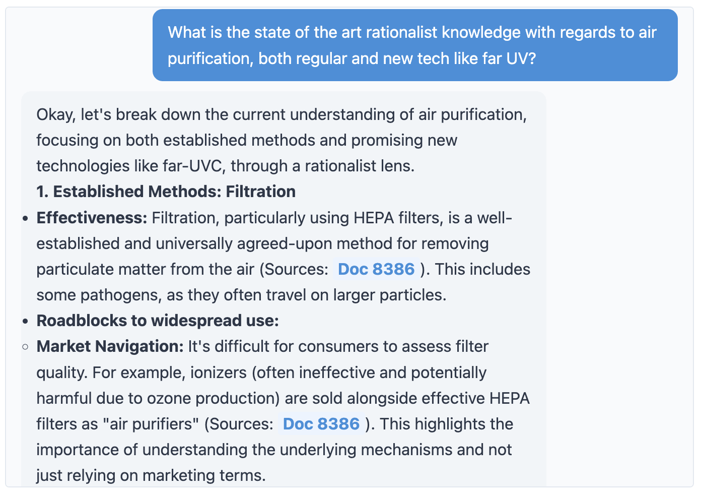 The intended use case was a sounding board for rationality related questions. Imagine "Ask The Rabbi" but for LW users. I sourced the documents from the community's "Best of" collection and the model is instructed to reference specific chunks in its answer. No air purifier articles were in the original set, but it's an interesting question so I have added them to the set: