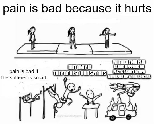 Third people proposed that the thing that matters is that they aren’t our species. But surely species is morally irrelevant. If we discovered that some people (say, Laotians) had the same capacities as us but were aliens and thus not our species, their pain wouldn’t stop being bad.