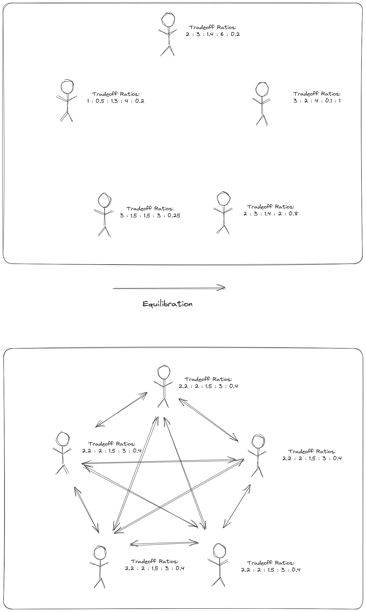 Two key ideas unify these examples. First, there are multiple “goals” - maybe multiple goods, maybe multiple agents’ utilities, maybe energy and entropy - and the system “equilibrates” at a pareto optimum of those goals. Second, there are multiple subsystems, each of which can contribute to the different goals.