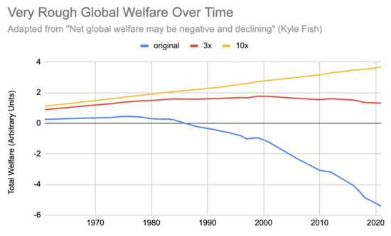 For example, if that sort of process ended up with moral weights that were 3x lower for animals relative to humans we would see approximately flat global welfare, while if they were 10x lower we'd see increasing global welfare: