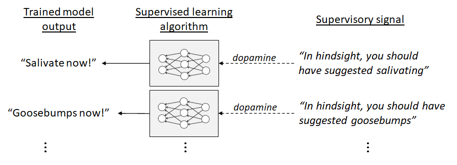 For example, one of the supervised learning circuits might have an output line to the hypothalamus & brainstem whose signals mean: “We need to salivate now!” The brainstem then has a dopamine supervisory signal going back up to that circuit, which it uses to correct those suggestions with the benefit of hindsight. Thus, if I suddenly find myself with a mouth chock-full of salt, then in hindsight, I should have been salivating in advance. The brainstem knows that I should have been salivating—the brainstem has a direct input from the taste buds—and thus the brainstem can put that information into the dopamine supervisory signal.