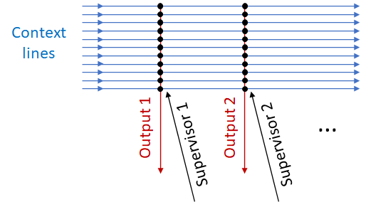The basic idea is: we have a bunch of “context” lines carrying information about various different aspects of what's happening in the world. The more different context lines, the better, by and large—the algorithm will eventually find the lines bearing useful predictive information, and ignore the rest. Then there’s one or more pairs of (output signal, supervisor signal). The learning algorithm’s goal is for each output to reliably fire a certain amount of time before the corresponding supervisor.