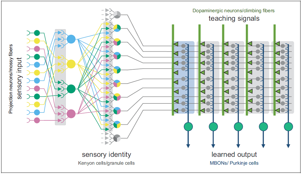 The drosophila equivalent of the pattern-separating cerebellar granule cells is “Kenyon Cells” (KCs), which take the ≈35-dimensional space of detectable odors and turn it into a ≈1000-dimensional space of odor patterns (ref). The axons of these cells are the “context lines” that our learning algorithms will sculpt into a predictive model. More recently, Li et al. 2020 found Kenyon Cells with other kinds of context information besides odor, including visual information, temperature, and taste. These were (at least partly) segregated—this allows the genome to, say, train a model that makes predictions based on odor information, and also train a model that makes predictions based on visual information, and then give one of those two models a veto over the other. That’s just a made-up example, but I can imagine things like that being useful.