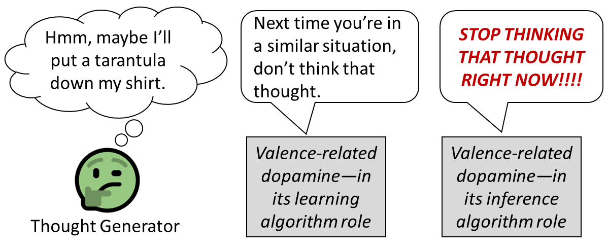 Anyway, in reinforcement learning, I think dopamine plays a role in both the learning algorithm and the inference algorithm. I have a fun diagram (from here) to illustrate: