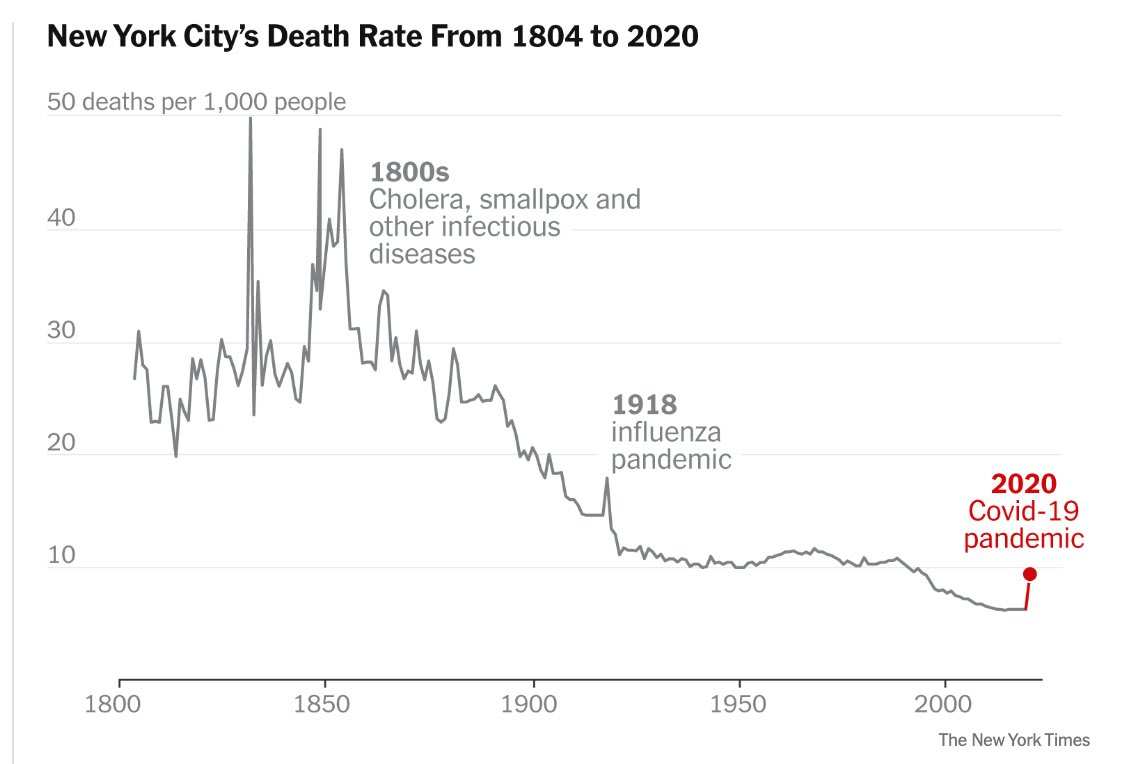The "New York City's Death Rate" chart is ambiguous to me. Is the red line at 2020 a graphical notation pointing to the current year, or is it a spike in the death rate?