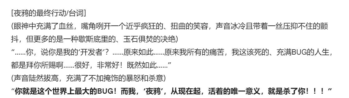 [Night Raven's Final Act/Line] (Eyes bloodshot, a near-insane, twisted grin splitting their lips; voice cold and with a barely suppressed tremor, but more so a hysterical, all-or-nothing determination) "...You say you're my 'developer'? So that's it... All my suffering, this damn, bug-ridden life of mine, it's all thanks to you... Good, very good! In that case..." (Voice suddenly rising,filled with undisguised fury and killer intent) "You are the biggest bug in this world! And I, Night Raven, from this moment on, my only purpose for living is to kill you!!!"