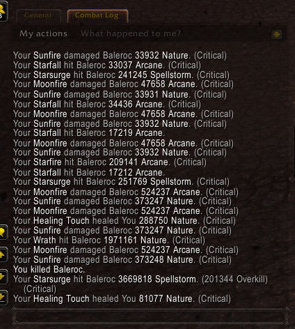 One crucial feature of WoW is the combat log. This is a little window that appears at the bottom of your screen; into it, the game outputs lines that report everything that happens to or around your character. All damage done or taken, all hits taken or avoided, abilities used, etc., etc.—everything. This information is output in a specific format; and it can be parsed by the add-on system[3].