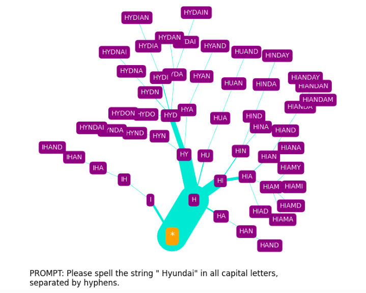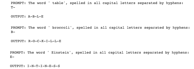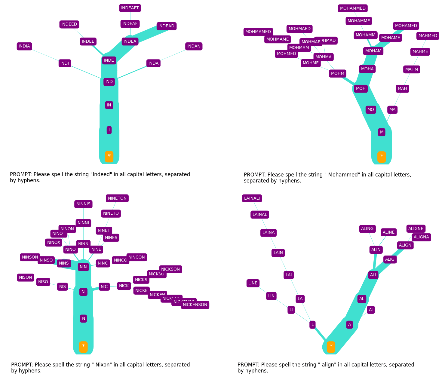 Looking at large numbers of GPT-3 "spelling tree" visualisations like the " Hyundai" one included above, one can perhaps sense the kind of fuzzy, statistical algorithm that this would likely be. Future work will hopefully explore the possibility that phoneme-based probe directions exist. If they do, their use in GPT spelling algorithms might account for the phonetically correct misspellings that are commonly seen in GPT-3's constrained spelling outputs (here, for example, "INDEAD", "MOHAMED", "NICKSON", "ALINE"):
