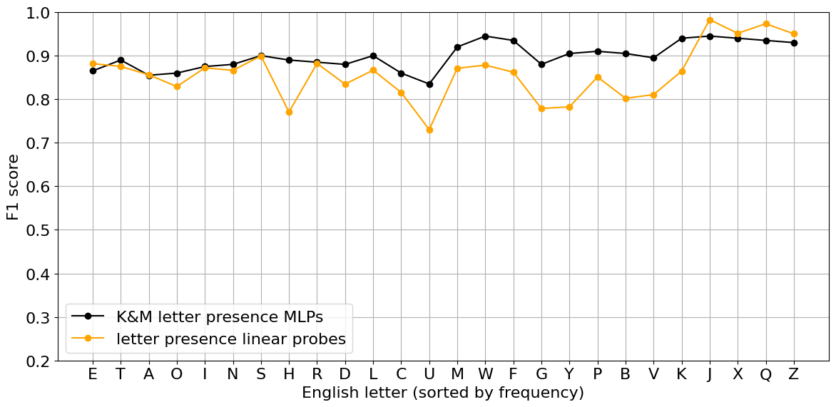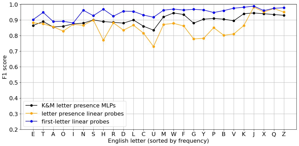 One might imagine that these authors would have first attempted to train 26 linear probes for this set of tasks, as so much more could be accomplished if this character-level information turned out to be encoded linearly in the token embeddings. As they make no mention of having done so, we undertook this simple training task. The linear probe classifier F1 results we achieved were surprisingly close to those of their MLP classifiers. This was without even attempting any serious hyperparameter tuning.[2]