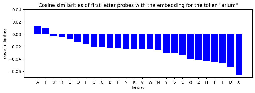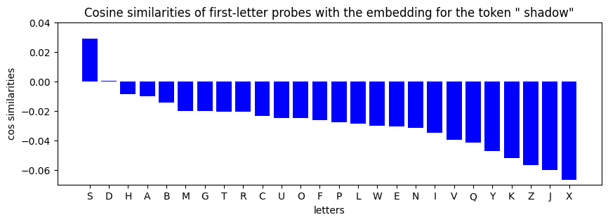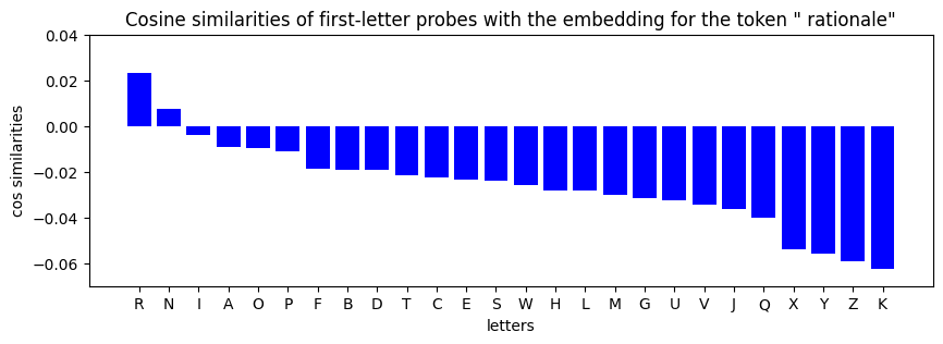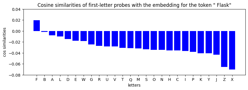Repeatedly choosing a token and then ordering the first-letter probes according to their cosine similarities with its embedding (as shown in the bar charts below), we see that the top-ranking first-letter probe almost always matches the token's first letter, while the token's subsequent letters are often heavily represented among the other highly ranked first-letter probes. Also, for a majority of tokens, the largest cosine similarity is the only positive value of the 26. The positive and negative values are generally negligible, suggesting that a token embedding will tend to point very slightly towards the direction of the relevant first-letter probe vector, and very slightly away from all of the others (with perhaps one or two exceptions).