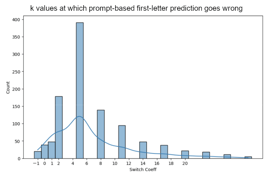 Further histograms were produced from the same data, but instead counting tokens where the "switched" first-letter prediction corresponds to the nth letter of the token, for the same range of k values (a histogram for each of n = 2, 3, 4, 5, 6). Again, these all display a similarly shaped curve. Generally, a k value of around 5 seems to be optimal for "blinding the model to the first letter of a token", regardless of what it then ends up "thinking" is the first letter.