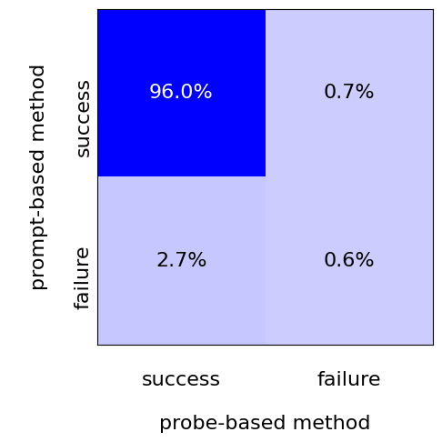 The string "<token>" begins with the letter "This outputs the correct letter for ~96.7% of tokens, while the probe-based method achieves ~98.7% accuracy.[5] The overlap between prompt- and probe-based failures is fairly small, as can be seen from this confusion matrix: