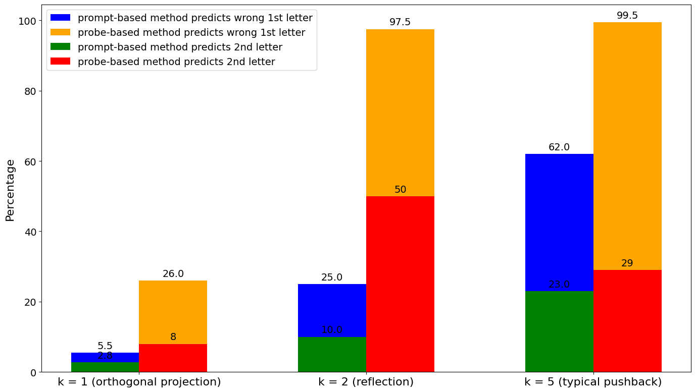 Regardless of this, the similarity of the two methods' accuracies can only add to the suspicion that GPT-J's ability to succeed on the prompt-based task is somehow dependent on its exploitation of the first-letter probe directions. After all, with access to the 26 directions, all that's needed to achieve GPT-J's level of predictive accuracy is the ability to take dot products and compare quantities.
