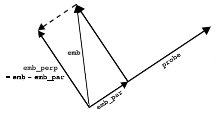 Note that by doing this, we're orthogonally projecting the emb vector into the probevector's orthogonal complement, that hyperplane/subspace consisting of all embedding vectors orthogonal to the probe vector.