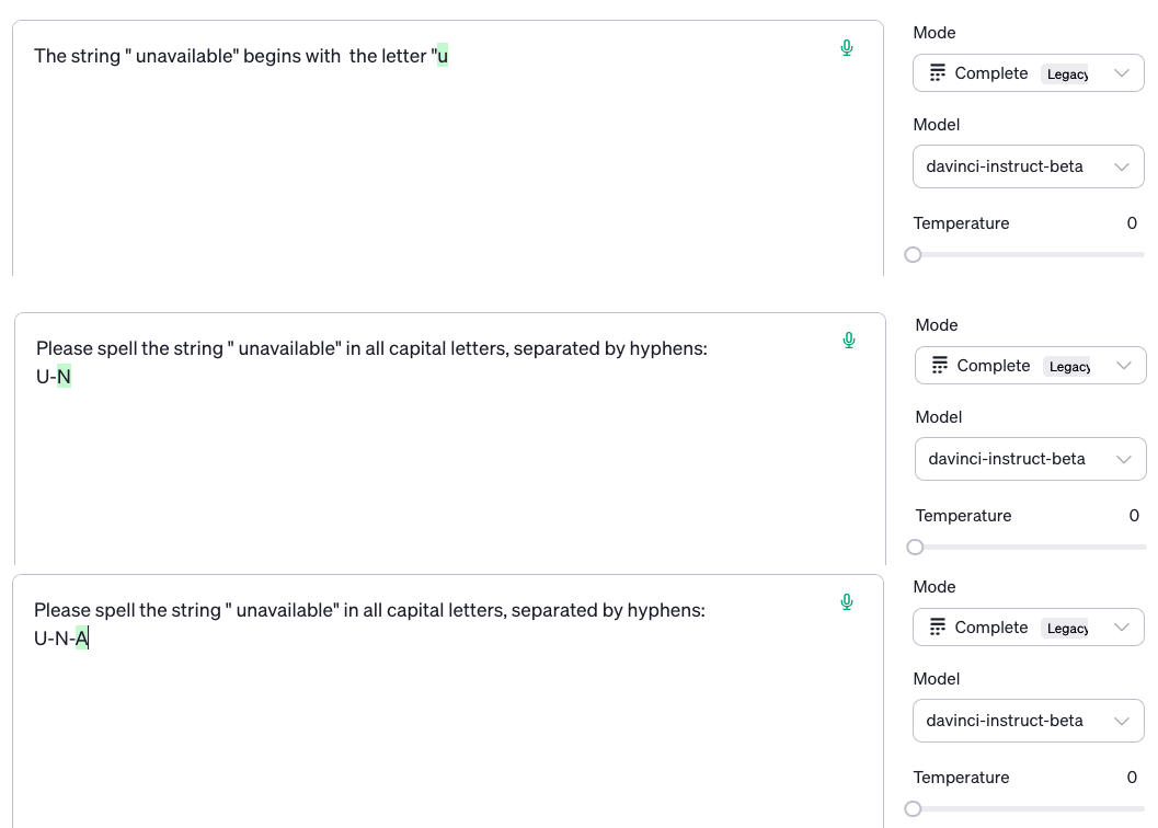 The knowledge of the letter "a" being present in " unavailable" is somehow inferred at some point in this multi-pass process, despite having defied all efforts to reliably access it with a single forward pass: